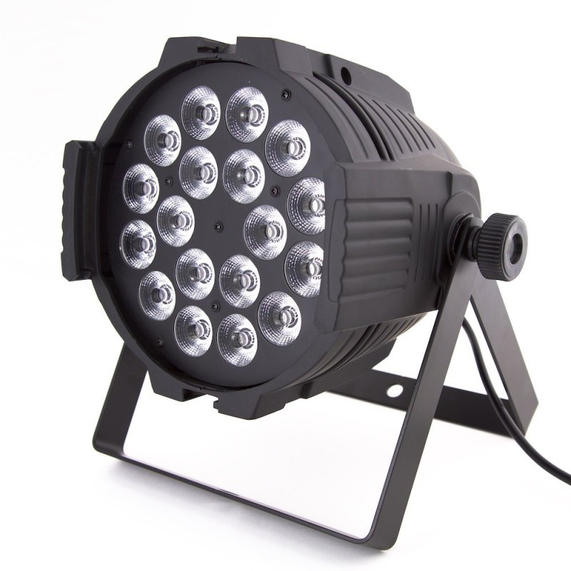 Светодиодный прожектор в алюминиевом корпусе. Имеет 18 LED светодиодов по 10W каждый ( технология 4 в 1). Цветосмешение RGBW. Угол раскрытия луча: 25°. До 50 000 часов работы светодиодов. Более 16.7 миллионов цветовых комбинаций. Система для киносъёмки "FlickFreetech" (RefreshRate >400 Hz). Степень пыле-влаго защиты IP20. Линейный диммер 0-100%, стробоэффект 1-20 всп./сек. Режимы управления: DMX512 - 4/8 каналов, master/slave,автоматический, музыкальная активация. Потребляемая мощность 200W. Размер: 220×300×330mm. Вес:2.5 кг.