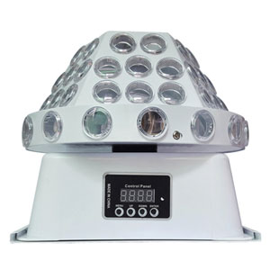 Светодиодный динамический световой прибор с эффектом картинок Гобо и множества тонких лучей. Имеет режимы стробирования и изменения цвета RGBW. Источник света:8 светодиодов по 3W производства компании Cree (красный:2шт.,зелёный:2шт.,синий:2шт.,белый:2шт.). Угол светового покрытия - 180 градусов. Режимы управления: звук/авто/ master-slave/DMX 512 – 6 каналов. Потребляемая мощность:40Вт. Вентилятор охлаждения. Размеры:21х21х18см. Вес: 2,4 кг.