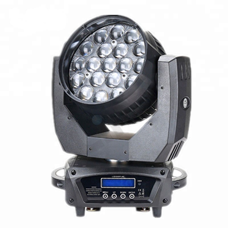 Вращающаяся голова типа Wash. Источник света: 19х15W OSRAM RGBW LED. Угол раскрытия луча (моторизированный линейный ZOOM): 8 - 60 градусов. Освещенность: при луче 60° на расстоянии 5 метров - 545 лк, при луче 8° на расстоянии 5 метров - 14335 лк. Освещённость более чем 40000 lux при расстоянии 2метра. Варианты управления: DMX 16/24 канала. Pan/Tilt: 540/270 градусов. Дисплей бело/голубой LCD. Powercon in/out. Линейный диммер 0-100% , строб 1-25 всп./сек. Высокоэффективный движущейся прибор, сильный эффект луча с функцией масштабирования, 3-х зонное изменение цвета в виде эффекта радуги. Режимы управления: DMX512/Master-slave/Auto/Sound.